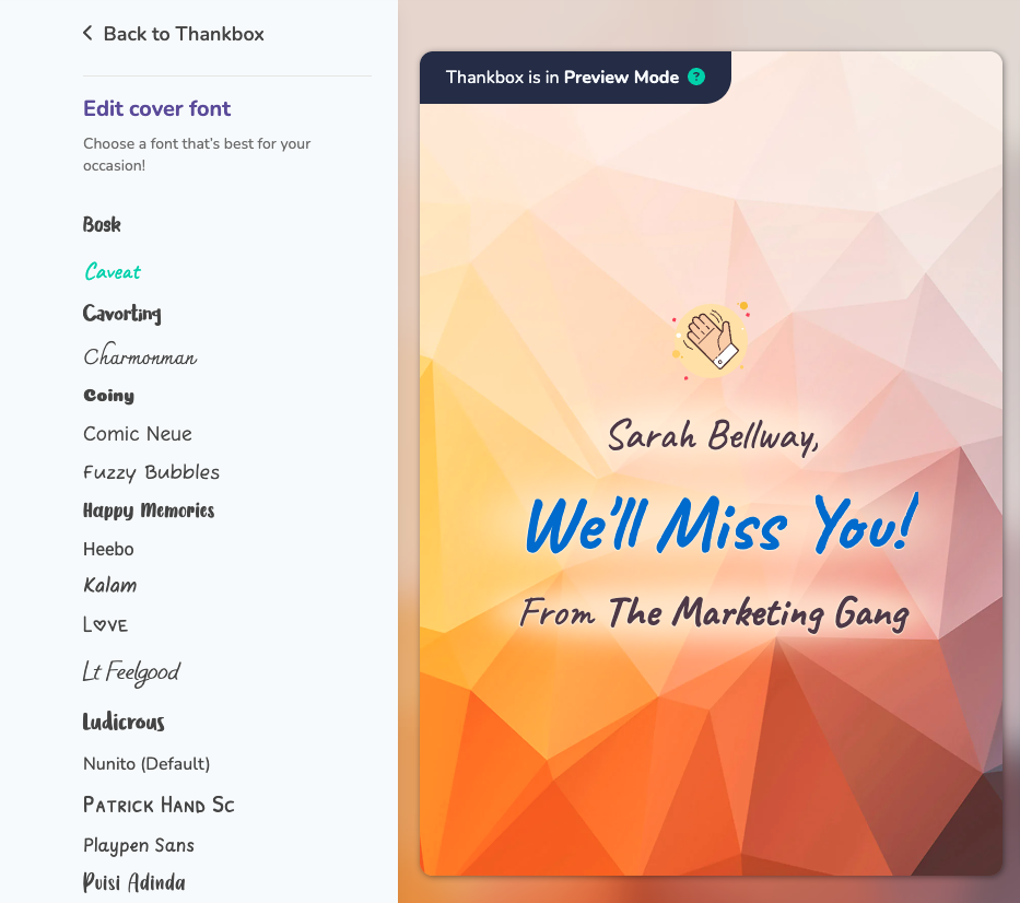 From there, you can select any of the available font options. When you've found the one that goes with the style of your card, go back to the Thankbox management page, and your selection will be automatically saved.