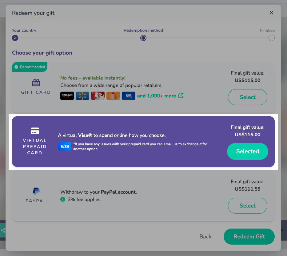 If your collection is in USD and your country supports it you may choose the Virtual Visa option.