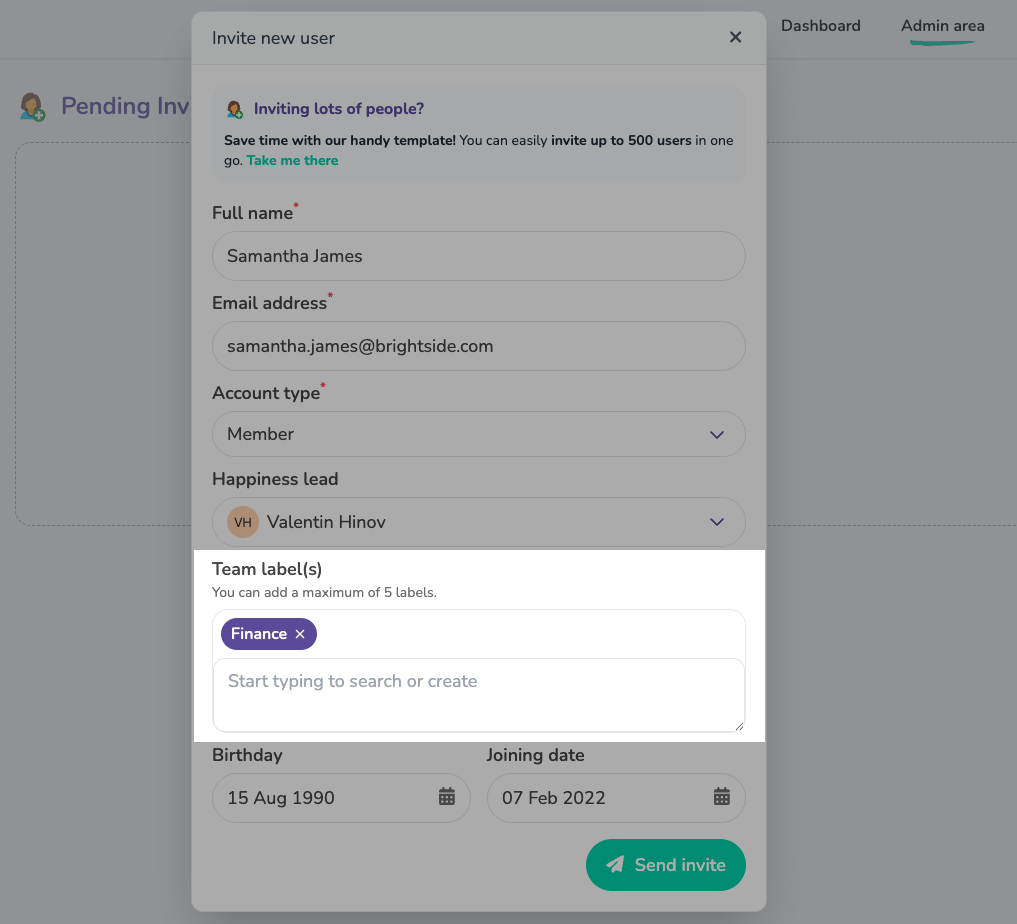 When inviting a new user, there is also a field where you can add one or more team labels (for example, Finance):