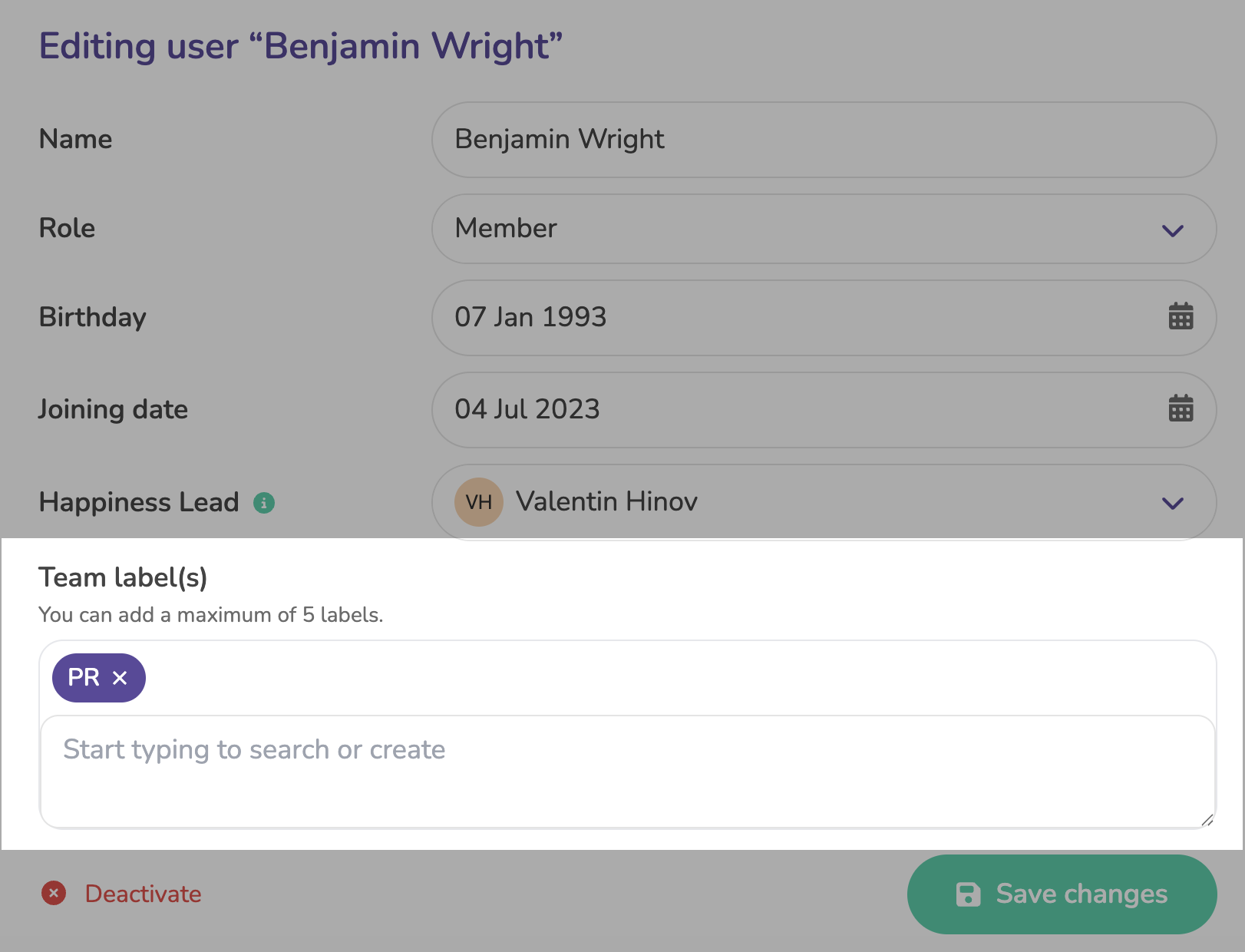 If the user is already in your organisation, you can open the User profile, click to edit it, and there you will see the same Team Label field where you can add, remove, or update the team label(s).