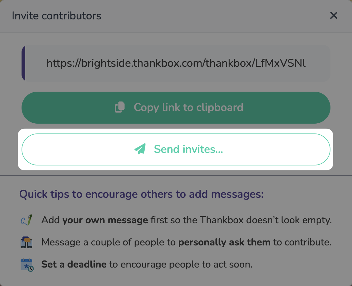 First, click the Invite others button from your Thankbox management page then click Send invites