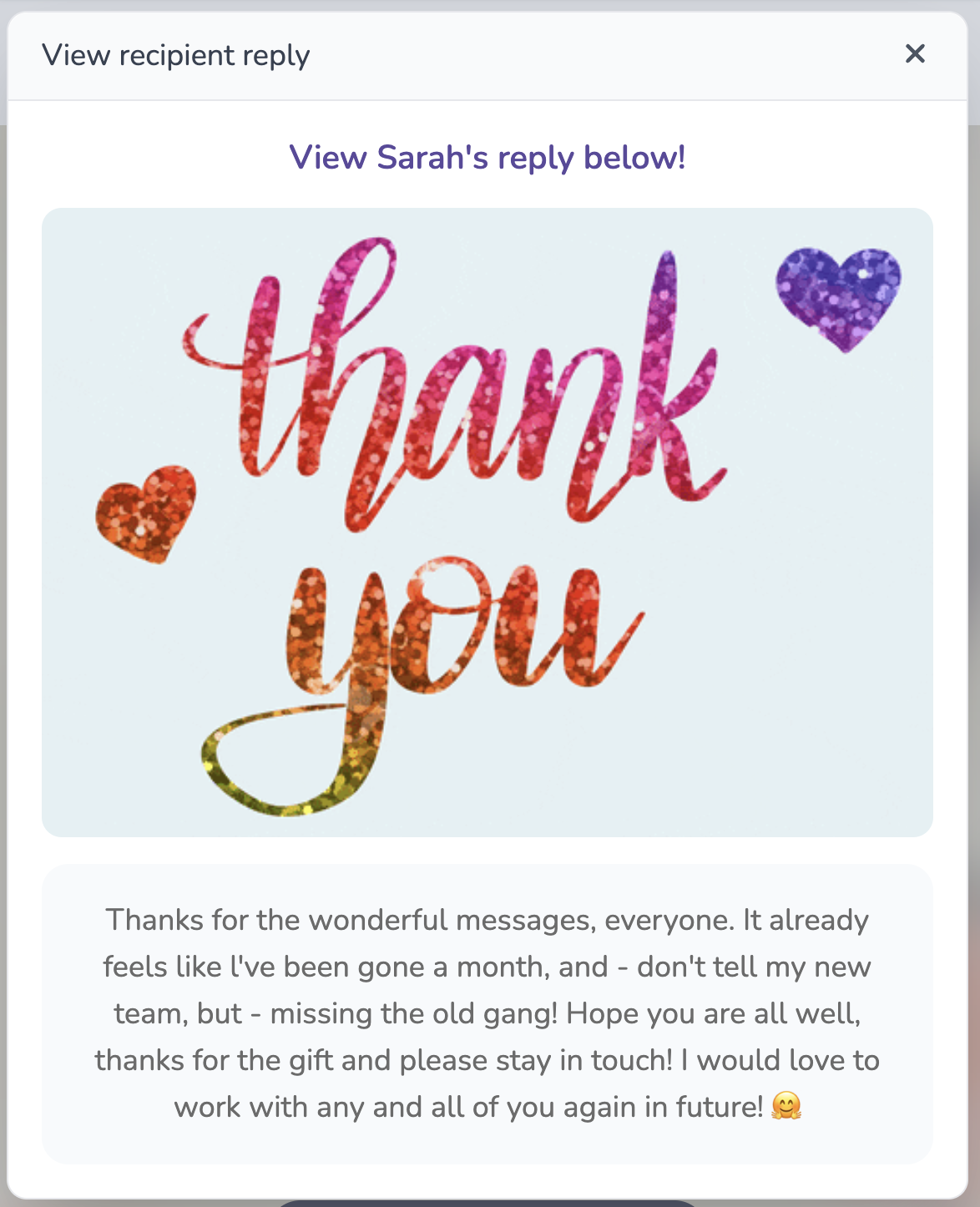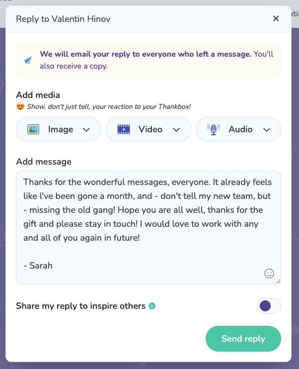 Your reply will be emailed to everyone who left a message and it'll also appear on the Thankbox itself for everyone to access.